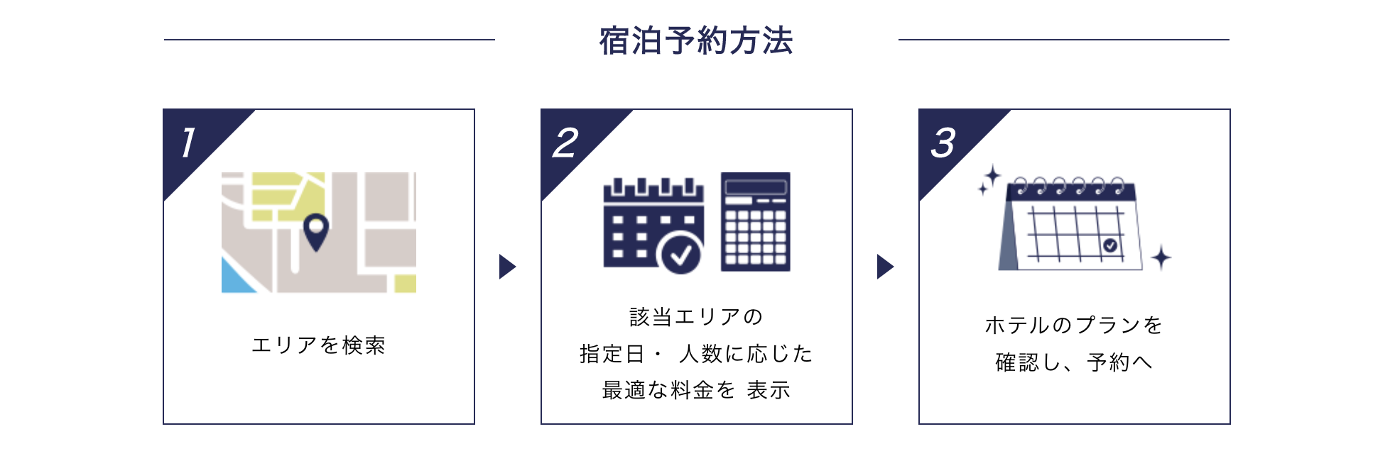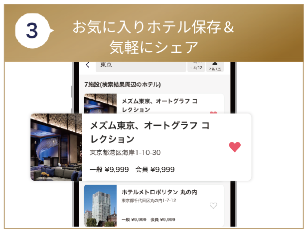 ご宿泊日・人数をご入力いただき「エリア」・「ブランド」・「お気に入り」など、様々な検索方法で予約可能な宿泊施設を簡単に探すことができます。